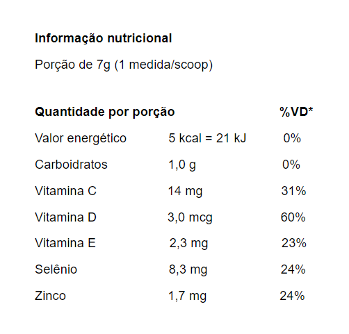 O mix de vitaminas C, E e D, ajuda a potencializar o sistema imunológico, possui ação antioxidante e anti-inflamatória, além de regular a absorção de cálcio, ferro e fósforo pelo organismo.